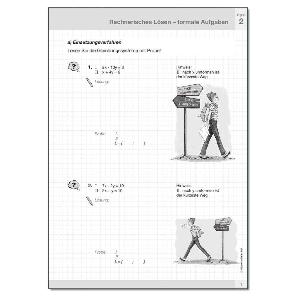 Darüber hinaus gestattet das beiliegende Lösungsheft die Verwendung des Materials durch Nicht-Mathematiklehrer für fachgerechte Vertretungsstunden, sobald der Mathematiklehrer einmal krank werden sollte. Ein solcher Einsatz ist sogar für das gesamte Stoffgebiet denkbar. Zu den dargestellten Lösungswegen ist anzumerken, dass diese jeweils nur Vorschläge sind. Insbesondere beim Lösen von Gleichungssystemen eignen sich mehrere Lösungsverfahren gleichermaßen.