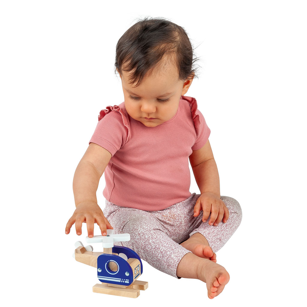 Mit diesem kompakten und stabilen Spielzeughubschrauber aus FSC® 100%-zertifiziertem Holz können kleine Piloten ab 18 Monaten in die Welt der Luftfahrt eintauchen. Die drehbaren Rotorblätter sorgen für ein realistisches Spielerlebnis, während die abgerundeten Kanten für eine sichere Handhabung sorgen. Durch die großen Fensteröffnungen ist der Hubschrauber besonders leicht zu greifen – ideal für kleine Kinderhände.
