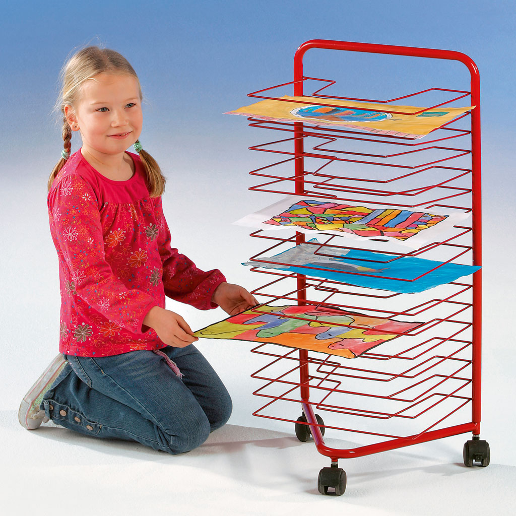 Der Trocknungswagen lässt sich durch die Rollen leicht bewegen. 2 der 3 Rollen sind feststellbar. Er bietet Platz für 17 kleine Kunstwerke bis zu einem Papierformat von DIN A3.
